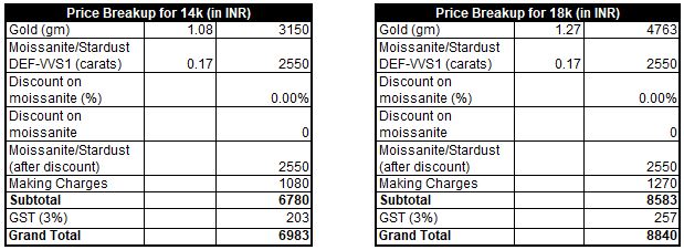 Gold Weight (approx) – 1.08gm (14k) or 1.27gm (18k)