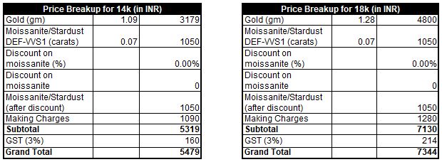 Gold Weight (approx) – 1.09gm (14k) or 1.28gm (18k)
