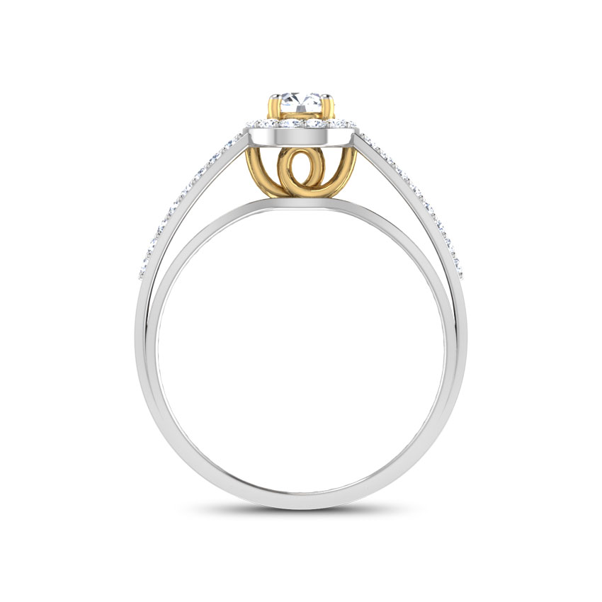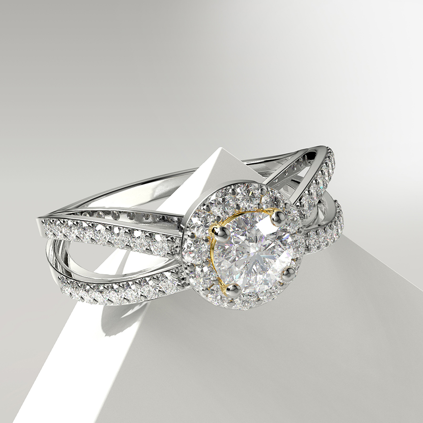 Multiple bands converge on the center stone, forming this solitaire ring with halo. Available in 14k and 18k gold purity and rose, white and yellow gold colour options.